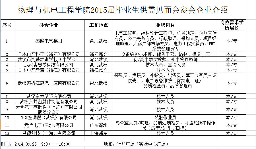 9月23日上午10:30盛隆电气集团对毕业生专科班进行集中宣讲,9月24日上午10:30盛隆电气集团对毕业生本科班进行集中宣讲。9月25日上午9:00举行供需见面会。