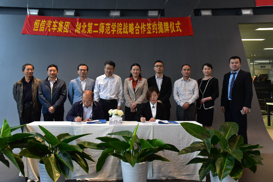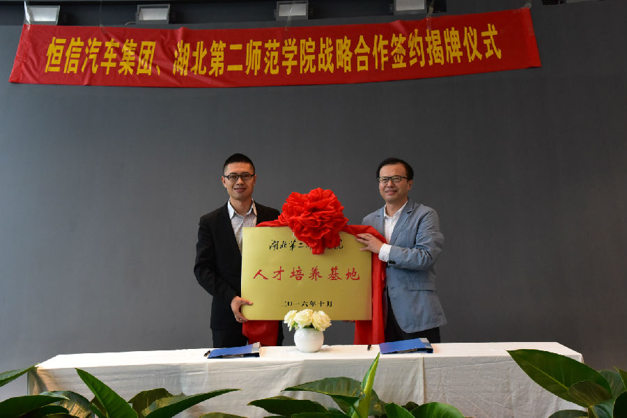 随后,肖明与恒信集团人力资源部部长刘忠闺签署合约,夏力与恒信集团业务部部长刘益波一同为实践基地揭牌并合影留念。