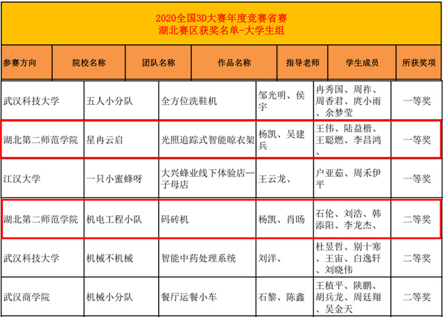 由杨凯老师、吴建兵老师指导,王伟、陆益楷、王聪燃、李昌鸿创作的作品《光照追踪式智能晾衣架》获得省级一等奖;杨凯老师、肖旸老师指导,石伦、刘浩、韩添阳、李龙杰创作的作品《码砖机》获省级二等奖。