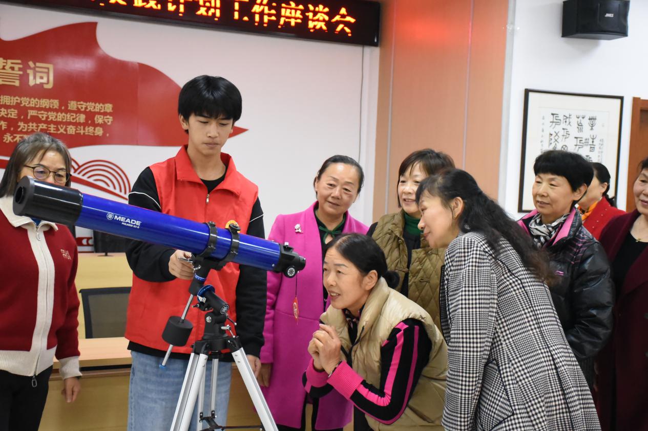 会后,志愿者向社区居民代表们展示智能机器人,天文望远镜等物机学院特色科创成果。(摄影邓哲皓)