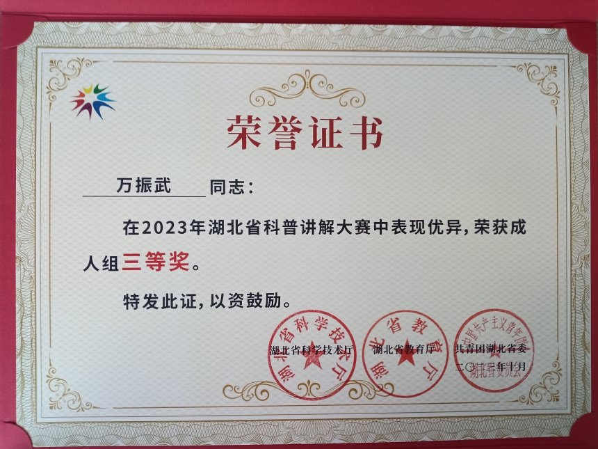本网讯(通讯员 杨宏鑫)近日,2023年湖北省科普讲解大赛获奖名单公布,william威廉中文万振武老师荣获成人组三等奖。