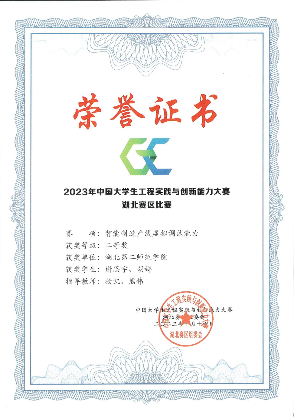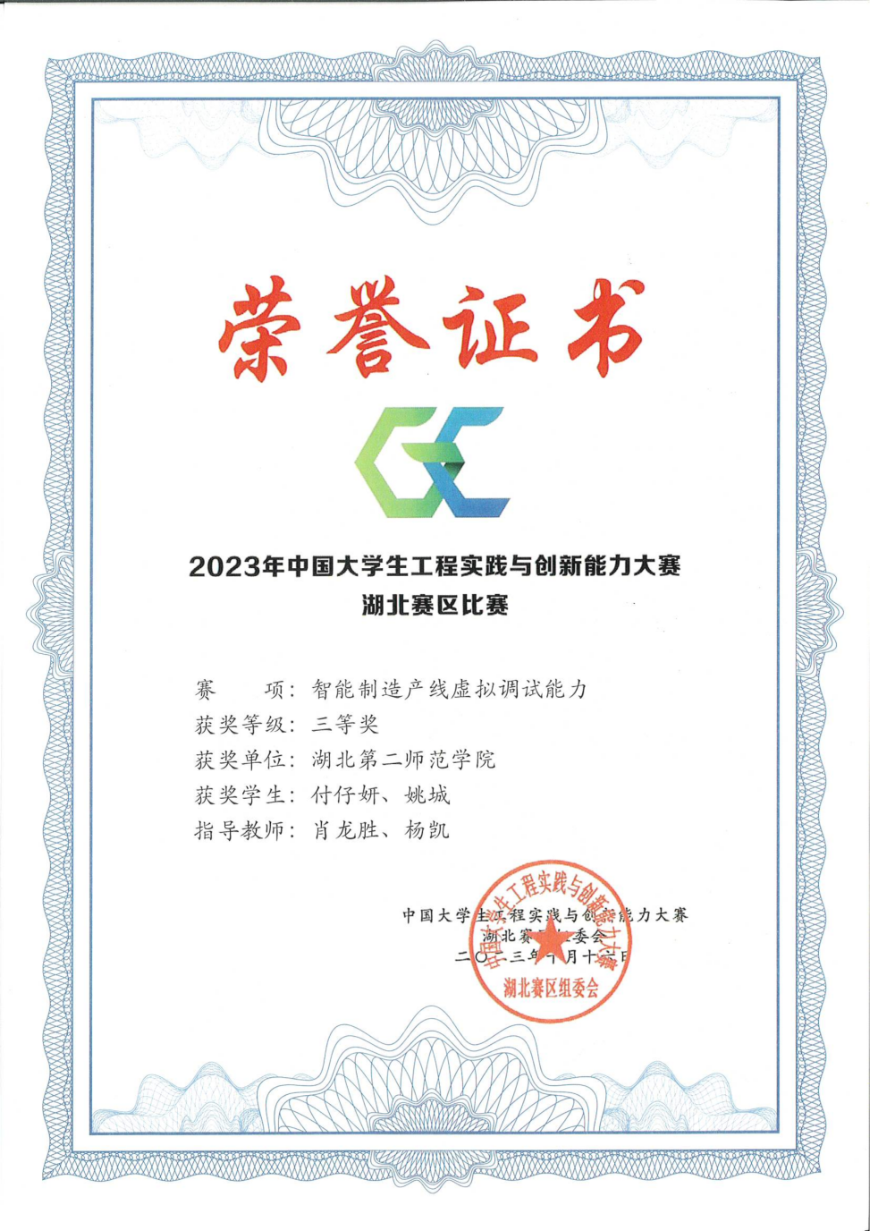 本网讯(通讯员 杨凯)近日,2023年中国大学生工程实践与创新能力大赛湖北赛区比赛在武汉理工大学举办,我院机械电子工程专业学子谢思宇、胡娜获智能制造产线虚拟调试能力赛项二等奖,付仔妍、姚城获智能制造产线虚拟调试能力赛项三等奖。