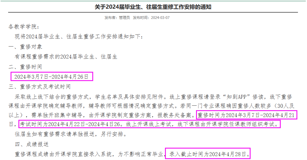 根据教务处通知,本学期重修工作分为两类学生重修,一类是本学期结束毕业的24届毕业生重修成绩单中还未及格的必修课程(不分学期),另一类是非毕业生重修往年春季学期开课期末、补考均未及格的课程(对应开课学期)。